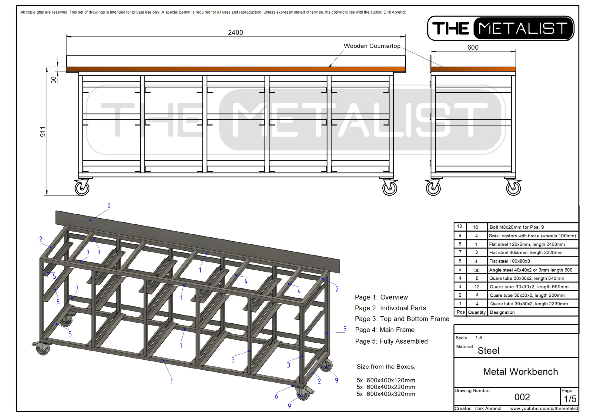 Die Werkbank hat die Maße 600 x 2400 mm und ist 910 mm hoch.